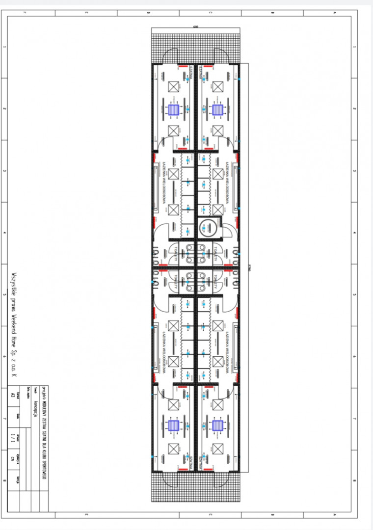 *Obiekt modułowy o konstrukcji samonośnej oparty o konstrukcję stalową wykonany z 8 modułów o wymiarach zestawionych w całość o wym. 27,80 m x 6,00 m
